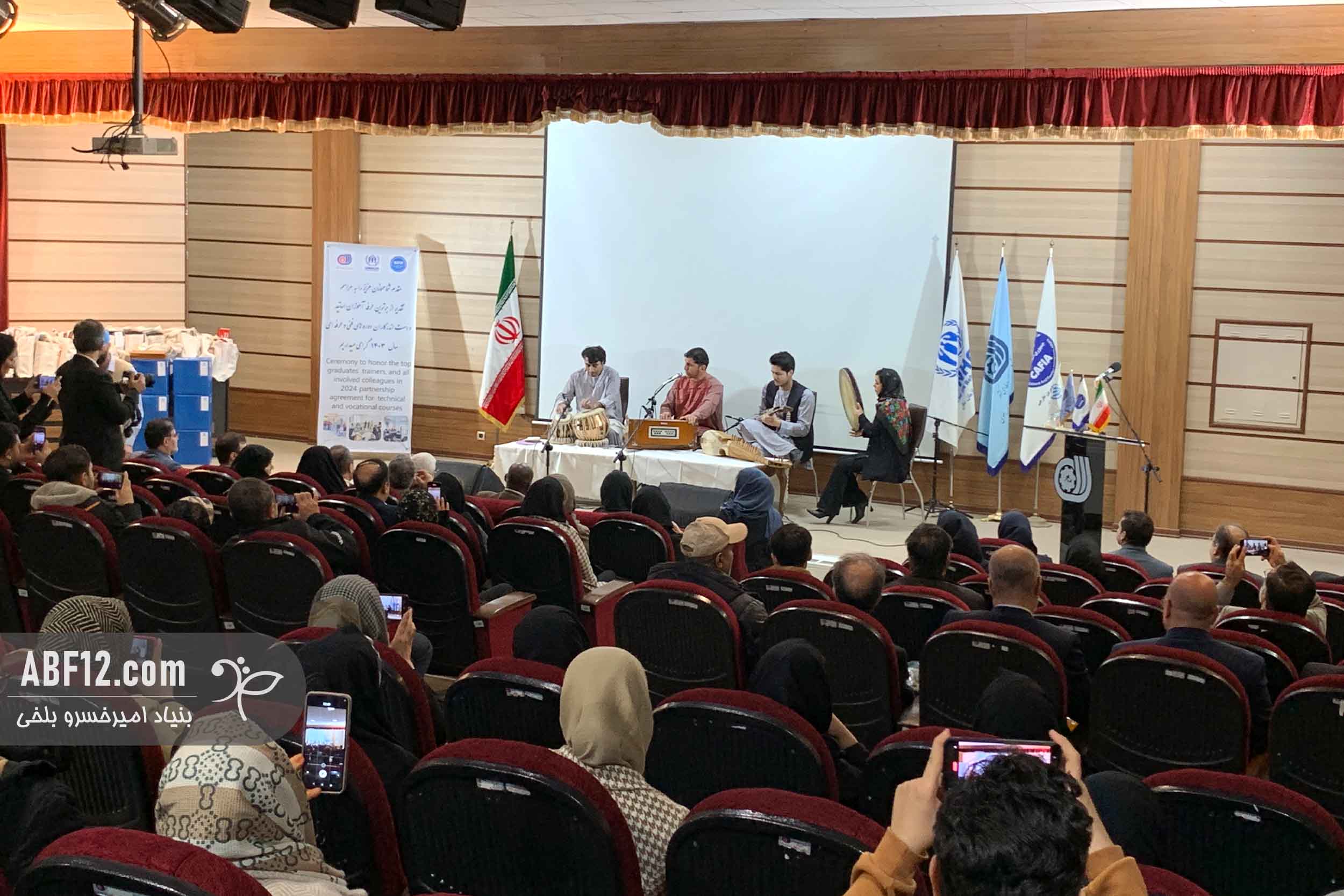 در مراسم ویژه «تقدیر از برترین حرفهآموزان و اساتید دورههای فنی و حرفهای» روز چهارشنبه ۳ دلو/بهمن ۱۴۰۳ در محل سالن همایش مرکز فنی حرفه ای ارم که با حضور مقامات بلندپایه دولتی و بینالمللی از جمله مسئولین سازمان ملل در ژنو و کمیساریای پناهندگان در تهران و مشهد، نمایندگان مرکز امور اتباع و مهاجرین خارجی وزارت کشور و استان خراسان و سازمان فنی و حرفهای کشور برگزار شد، بخش موسیقی برنامه با اجرای هنرمندان بنیاد امیرخسرو بلخی به شکلی برجسته و تأثیرگذار اجرا گردید.
